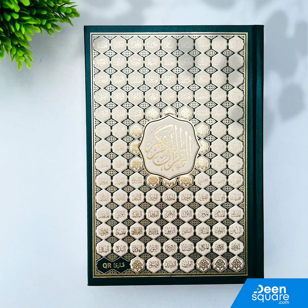 Beautifully printed Quran in Uthmani Script with 15 lines per page and white pages, in a standard size (14 x 20 cm) for easy reading. The cover features the 99 Names of Allah (Asma ul Husna), making it an ideal gift for loved ones, for placing in mosques, or for personal recitation and memorization. Durable and elegant, perfect for daily use and special occasions.